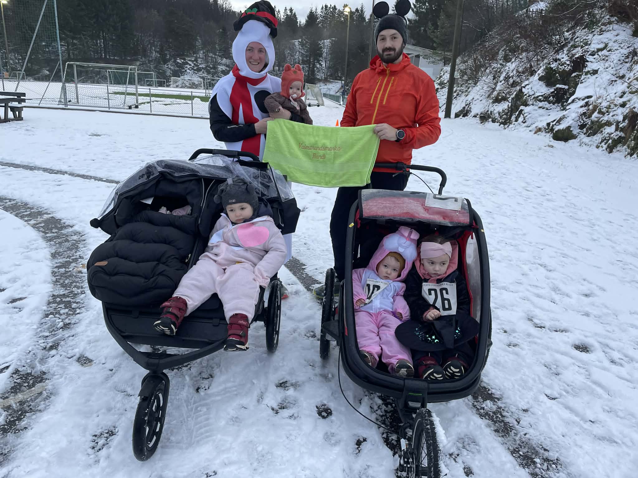 Familien Mjøs med store og små med flott innsats og antrekk fekk VM badehandkle i premie.